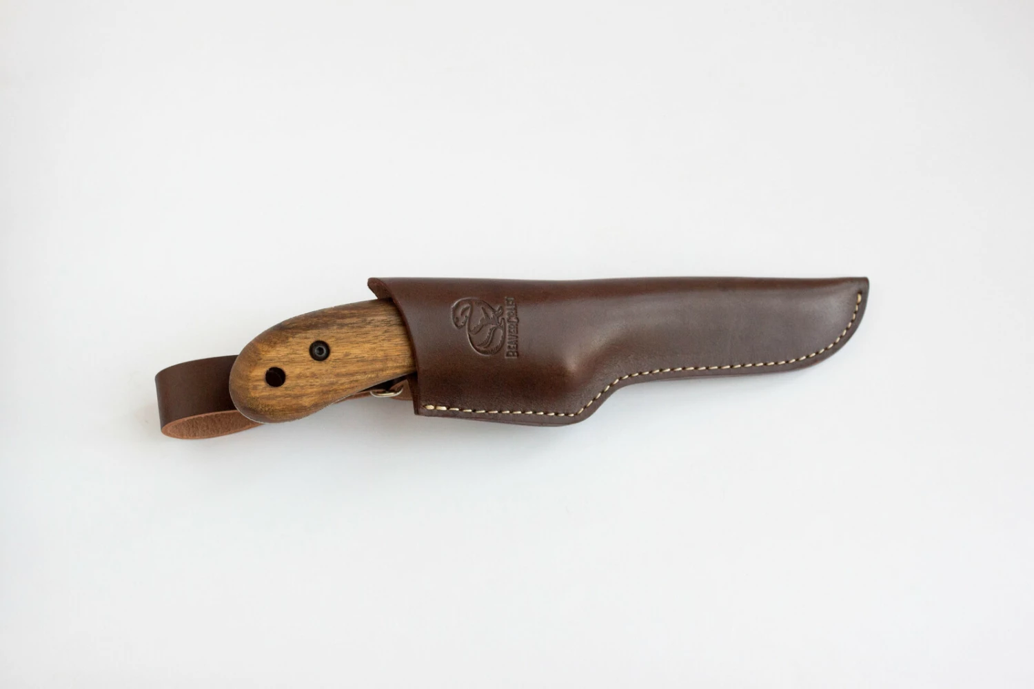 The knife comes with a leather sheath to keep the blade protected and secure. You can put the sheath onto your belt while you are outside.