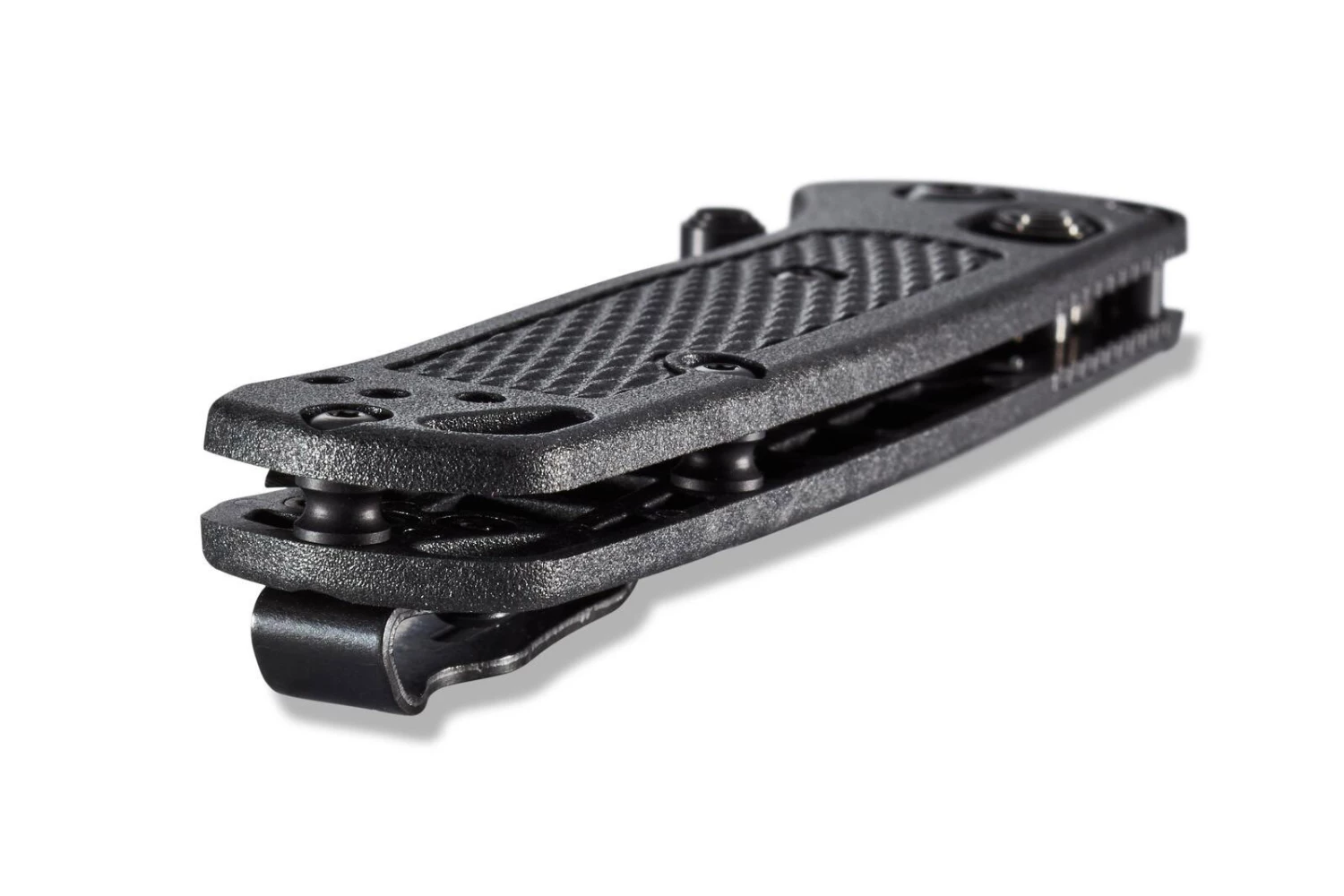 Benchmade’s all-black variant of the Mini Bugout packs a mean punch, and does it with class. The Mini Bugout maintains the same material configuration as its full-sized counterparts in a 42 gram package. Mini Deep Carry clip with black oxide finish. With a closed length of less than 10cm, this ultralight folder is small enough for a mint tin, yet big enough for adventure. This version 533BK-2 features black DLC-finished blade and black CF-Elite® handle.