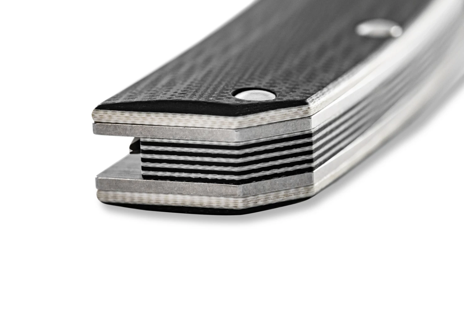 Blurring the lines between traditional design and modern technology, the 601 Tengu epitomises the style of Jared Oeser’s custom designs. This slim and classy flipper is packed with detail, from the CPM-20CV blade to the dual colored G10 handles. Complete with a black leather carry sleeve, the Tengu is bound to impress those looking for something different.
