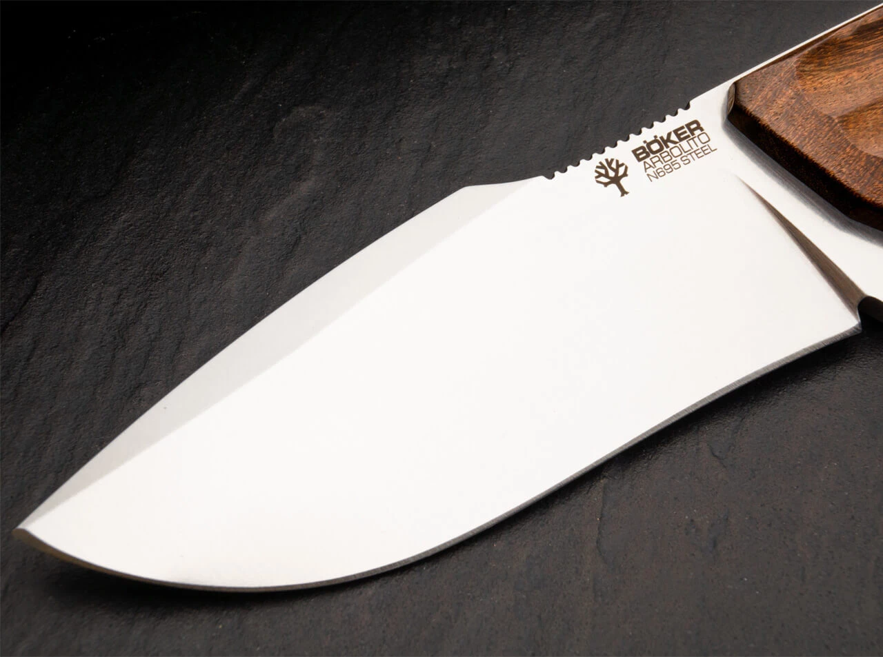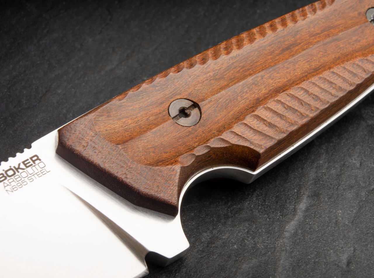 The sturdy Arbolito Bison has a heavy blade of Böhler N696, which makes it the perfect hunting knife for bigger game. The sturdy full-tang design includes a fluted spine and thumb ridge as well as a deep finger choil for extra safety. On the handle butt, the tang is slightly extended past the handle scale and can be used as a hammer plane. The handle scales of exquisitely processed Guayacan ebony, lends the knife an elegant appearance. With a lanyard hole and brown leather sheath.