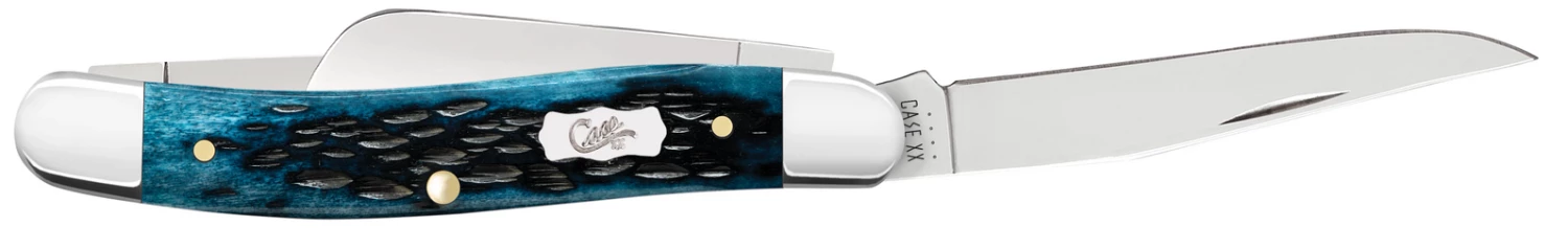 The Pocket Worn® Mediterranean Blue Bone rises to new heights of eye-catching satisfaction. Peach seed jigged for a great feel in the palm, this handle material complements the mirror-polished Tru-Sharp surgical steel blade and Case lobed shield in a rich, timeless combination of beauty and precision craftsmanship. The Trapper gets its name from the consumer it was designed for. It is a jack knife with two full length blades; a slender Clip and a long Spey. The Clip blade is commonly used as a multi-purpose blade and preferred for detail work while the Spey blade is commonly used as an all-purpose utility blade. This knife is constructed with Case Tru-Sharp™ stainless steel which is a special high-carbon steel that helps the blades hold an edge longer than conventional steel. It also offers extraordinary blade strength and corrosion resistance.