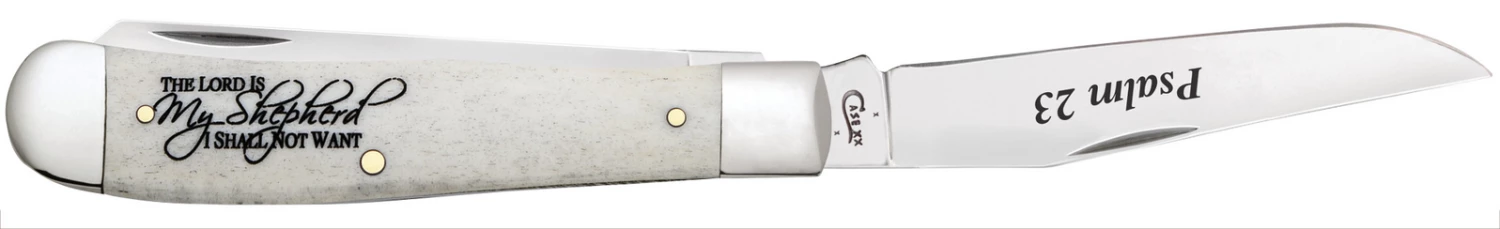 This Trapper is a part of the Case Religious Sayings Family. Embellished with uplifting messages, these popular patterns from their inspired collection are a trustworthy tool-like faith in your pocket. The Trapper gets its name from the consumer it was designed for. Because of its basic trapping and skinning blades and its light weight, it is a must-have knife for those who trap small game. It is a jack knife with two full length blades; a slender Clip and a long Spey. The Clip blade is commonly used as a multi-purpose blade and preferred for detail work while the Spey blade is commonly used as an all-purpose utility blade. This knife is constructed with Case Tru-Sharpâ„¢ stainless steel which is a special high-carbon steel that helps the blades hold an edge longer than conventional steel. It also offers extraordinary blade strength and corrosion resistance.