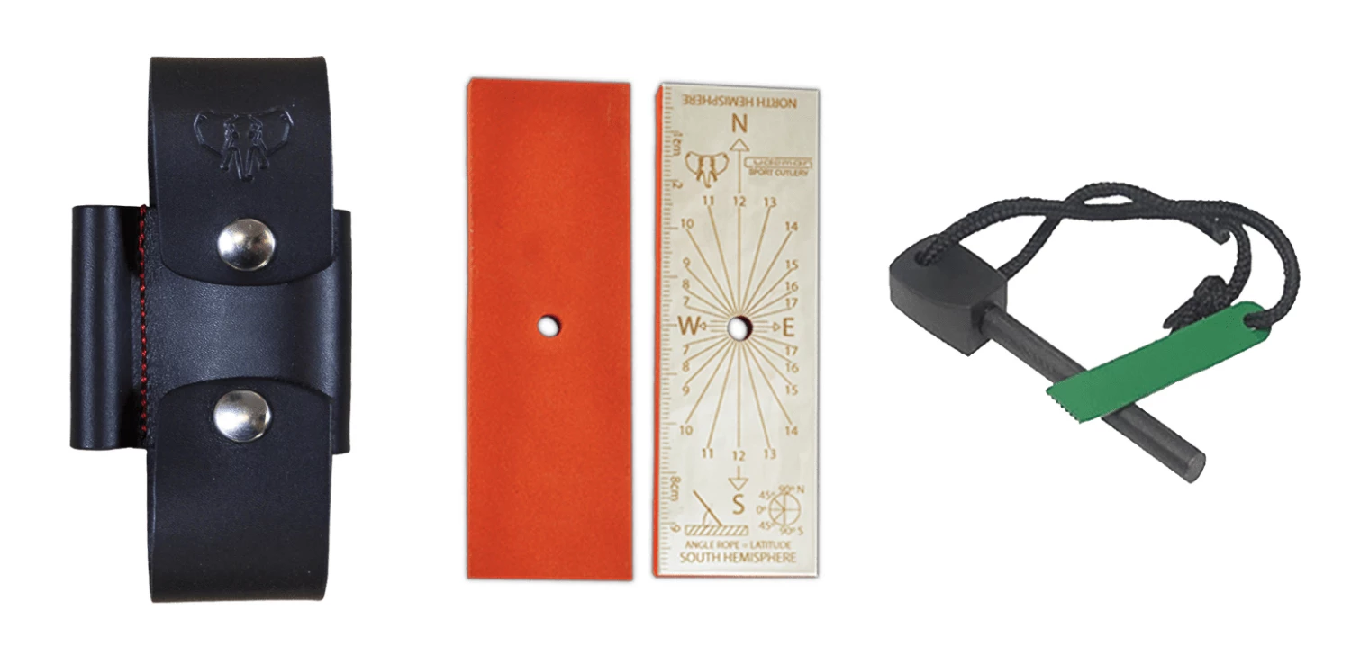 A genuine Cudeman adaptor kit provides survival essentials designed to complement Cudeman survival knives. Encased in a Black leather storage pouch it contains a firesteel fire starter, sharpening stone and signalling mirror.