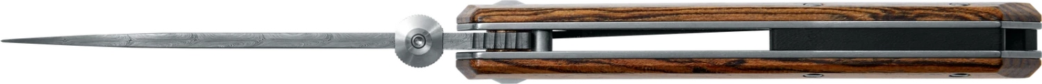- 364 layer ATS-34 + PMC-27 Damascus steel blade showcases a detailed Ladder pattern