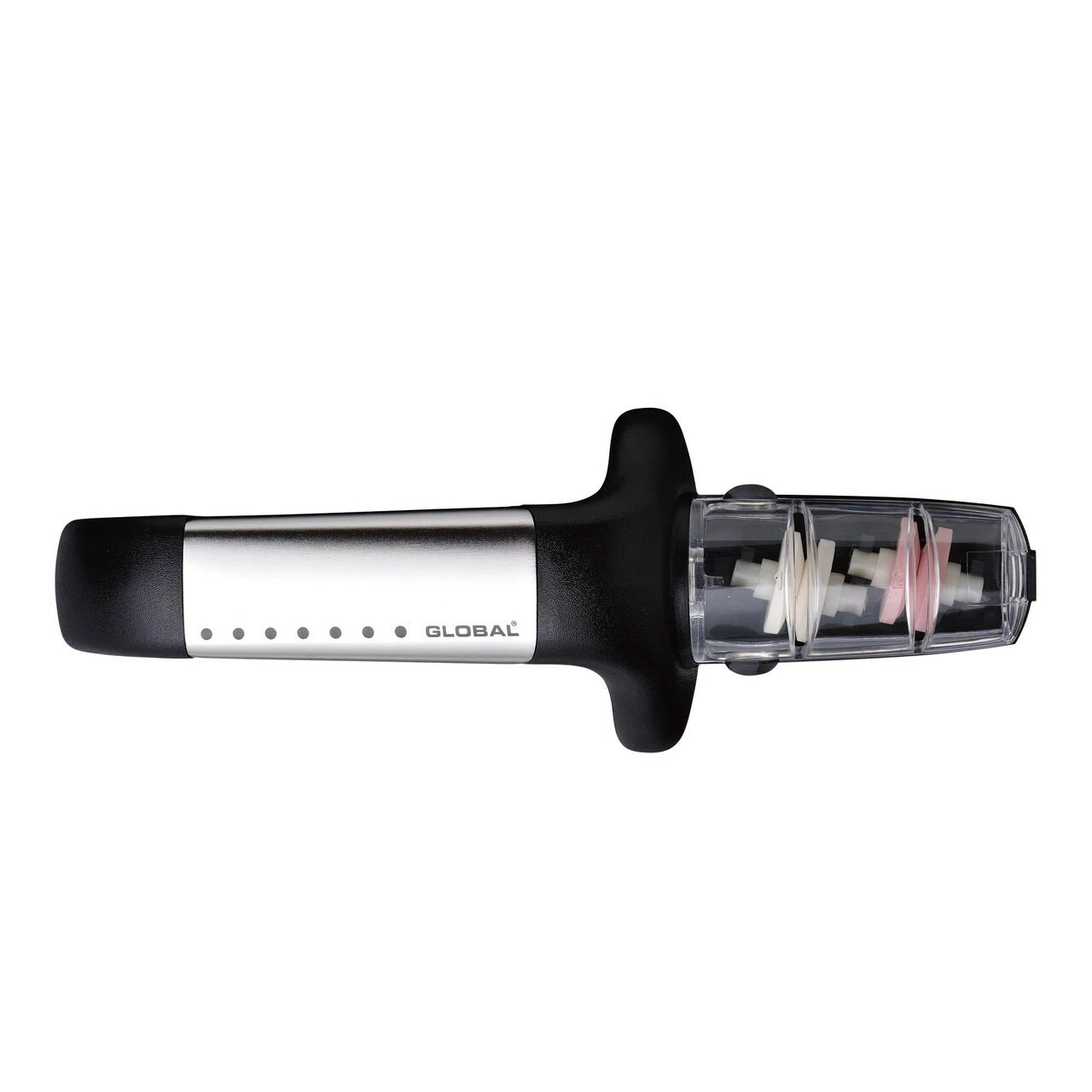 This safe and simple to use sharpener will ensure your valuable knives remain extremely sharp and ready for anything in the kitchen. Although designed for GLOBAL knives, this sharpener can be used for any knife brand with a 15-degree angle, which is a common angle for Japanese knives. Replacement wheels are available to purchase separately as the ceramic wheels will wear out after time – their life expectancy will vary according to frequency of use.