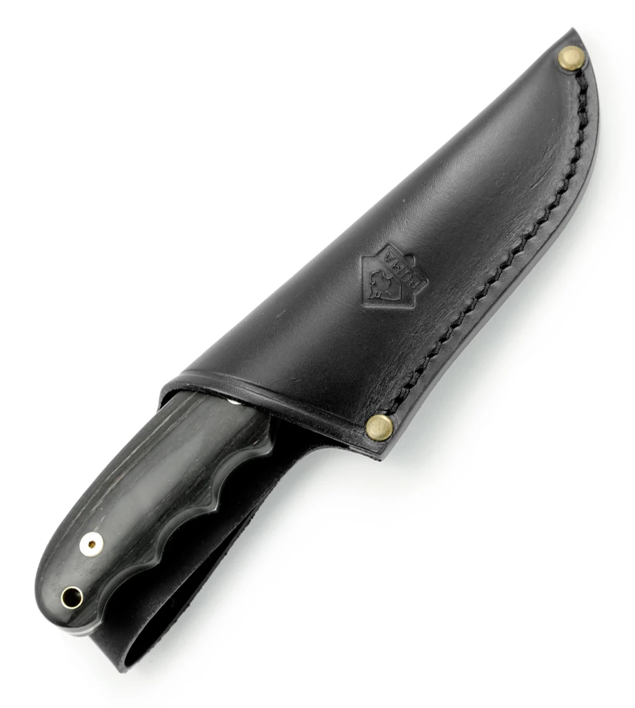 With the SAUBART model, PUMA offers a cleanly crafted hunting knife in full tang construction. The blade material is stainless Sandvik steel 14C28N, which has a legendary Rockwell hardness of 60-62 HRC. The well-fitted handle scales made of pakka wood ensure a secure grip when working with the knife, thanks to pronounced finger recesses in combination with a strong nickel silver toggle. A sheath made of saddle leather is included for transport and storage.