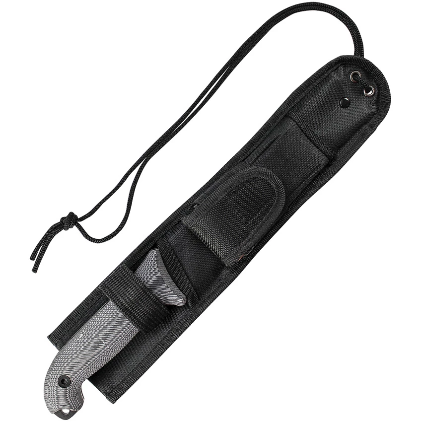 Milling on the Micarta handles defies the elements by providing a sure grip in any weather condition while also offering a contoured design that fits with your hand’s natural shape. Pass cordage through the lanyard hole to keep the SCHF52M close at hand. The black polyester sheath, with its Velcro loop, makes it easy to attach the sheath without the need to remove your belt. Lash the sheath to your leg or other gear with the available cordage.Â