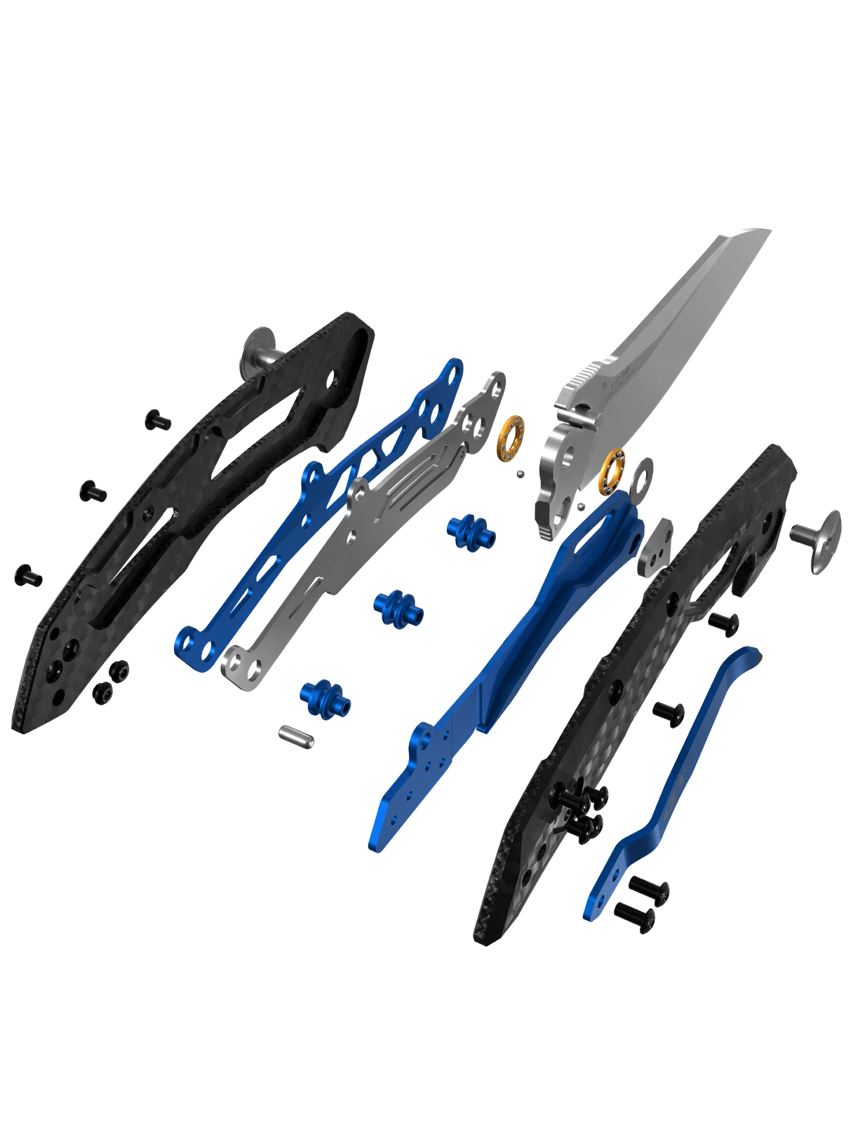 - Matching blue-anodized hardware, Sub-Frame Lock, and reversible titanium pocket clip compliment the black carbon fiber
